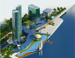 La présente mission a consisté à une assistance à l'agence d'architecture de Guillaume Koffi, pour la réalisation d'un complexe hôtelier de 95 000 m2 de SHON. Ce complexe hôtelier comprend 175 chambres et 20 suites dans un immeuble de 30 niveaux, un centre commercial, une marina, un restaurant panoramique, 13 000 m2 de surfaces utiles de bureaux et d'espaces de congrès, 5 000 m2 SU d'espaces résidentiels et 20 000 m2 de surfaces utiles de stationnement.